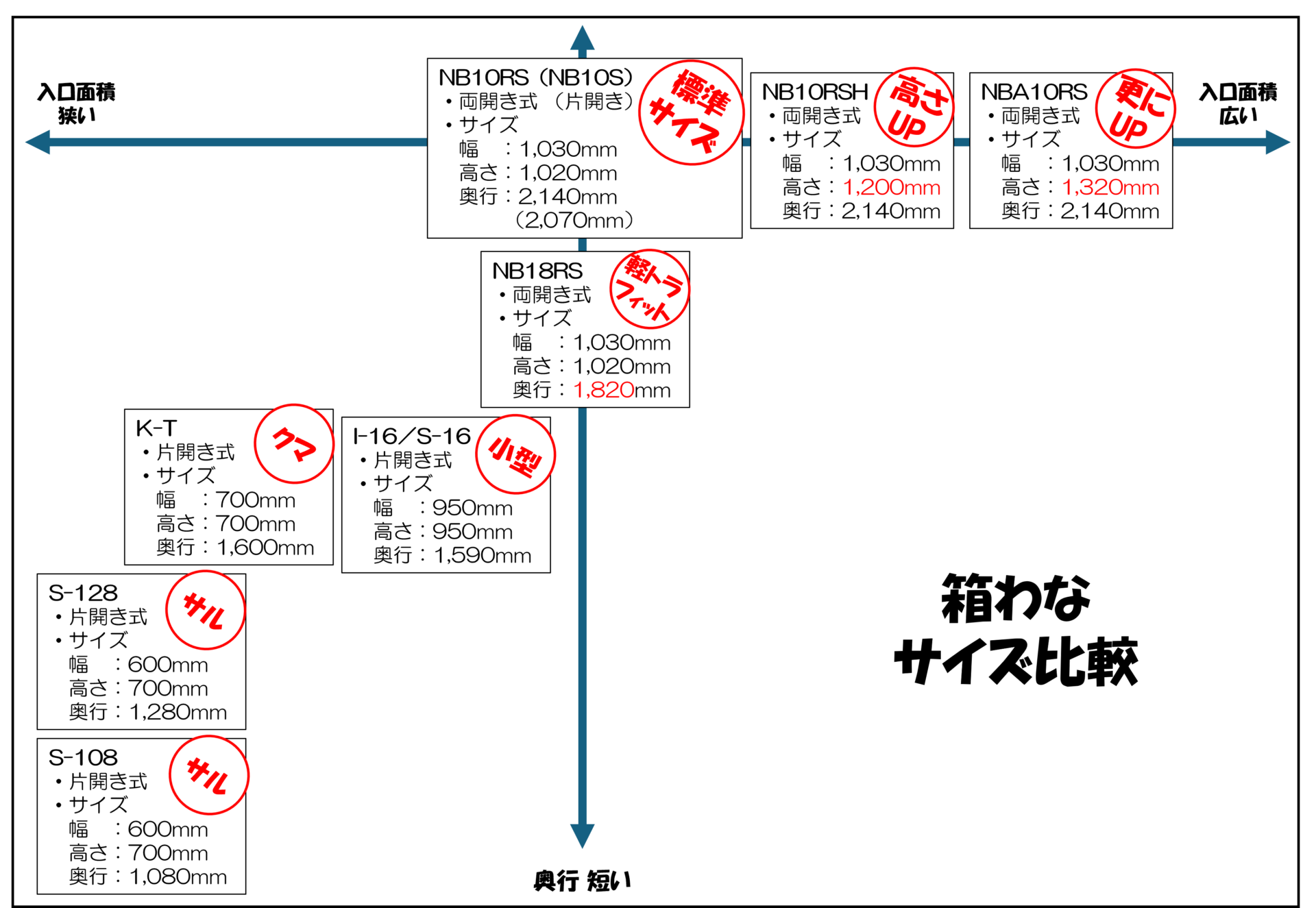 2025.10.03 箱わなサイズ比較 箱わなの写真を見ても、サイズの違いがいまいち掴みにくい…ということで比較表を作ってみました。弊社スタンダードモデル「NB10RS」を基準に、入口面積と奥行で比較しています。サイズ検討の参考にして下さい!