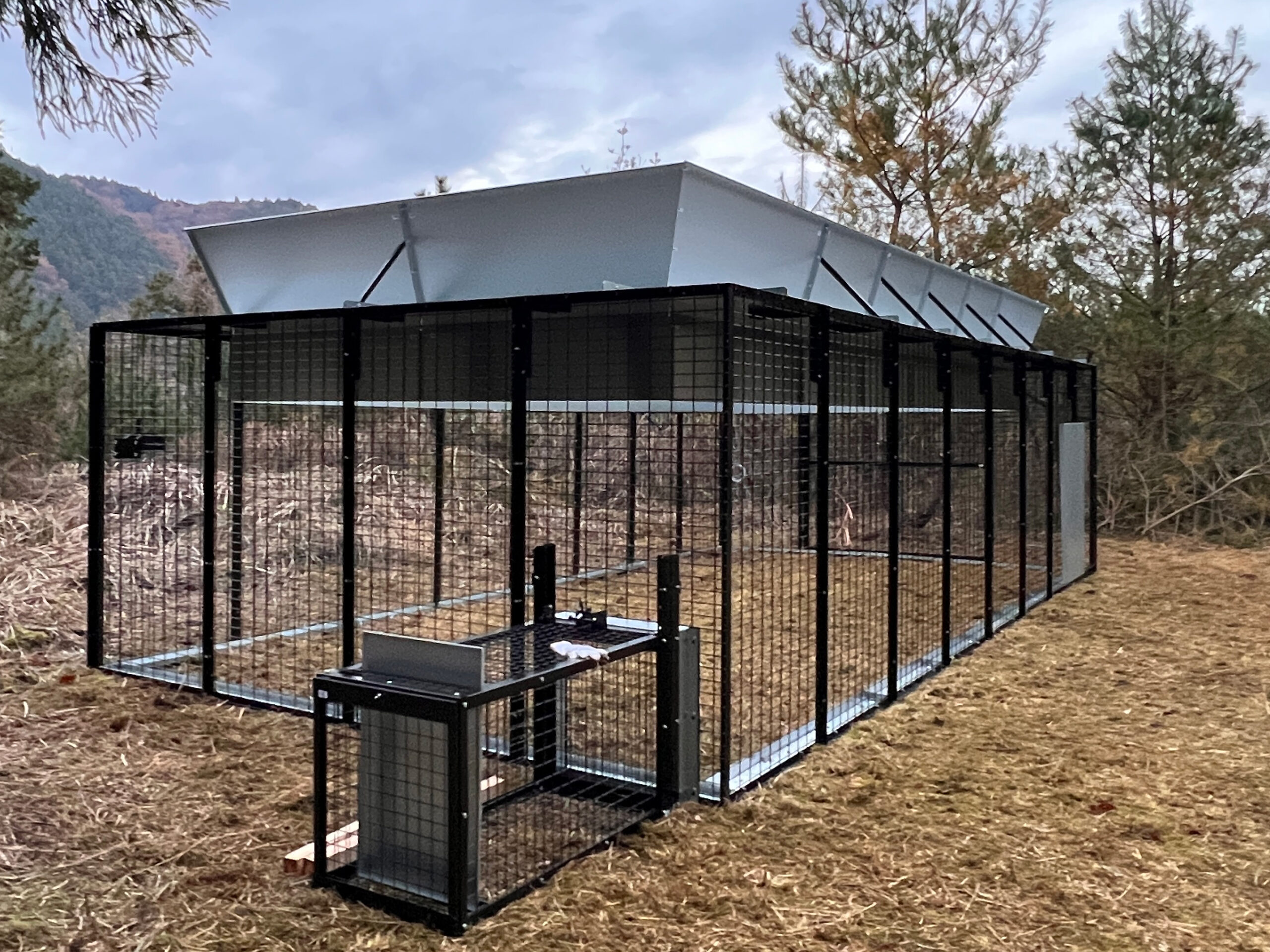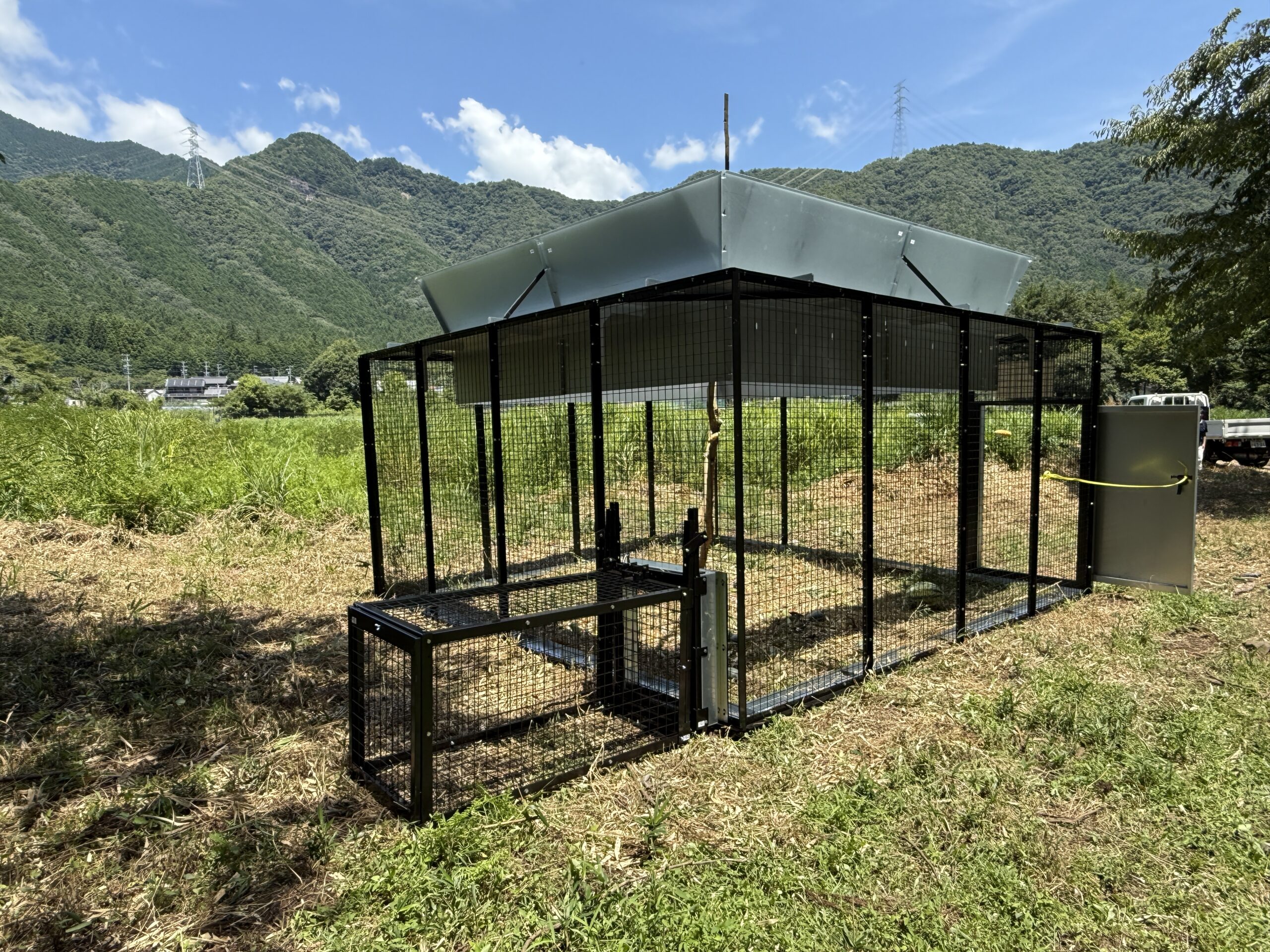 サルの群れを多頭捕獲するため、これまで開口扉式の天井付きの囲いわな(大型箱わな)が使われてきました。このタイプの場合、わなに侵入した最初の1頭が蹴り糸(仕掛け)に当たってしまうと扉が閉じて後続が捕獲できないというデメリットがありました。蹴り糸の位置や高さを工夫したり、IoT機器を導入するなど、多頭同時捕獲には様々な対応が必要でした。